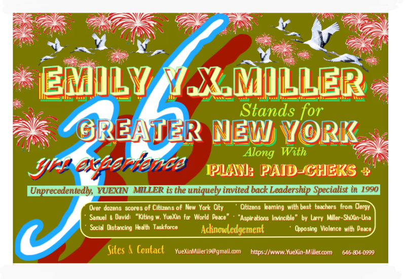 - Now in time of the Covid-19 global pandemic and its aftermath, Mrs. Yuexin Miller is arising from 60% injury-healing once again with some support from family & relatives. Mrs. Emily YueXin Miller is focusing on celebrating life & healing with us all by leading our NY neighborhoods & communities where she has always lived for over 30 yrs with 2022-26-RRECOVERY-PLA: P.A.I.D.- C.H.E.K.S + in our communities' gradual opening up.