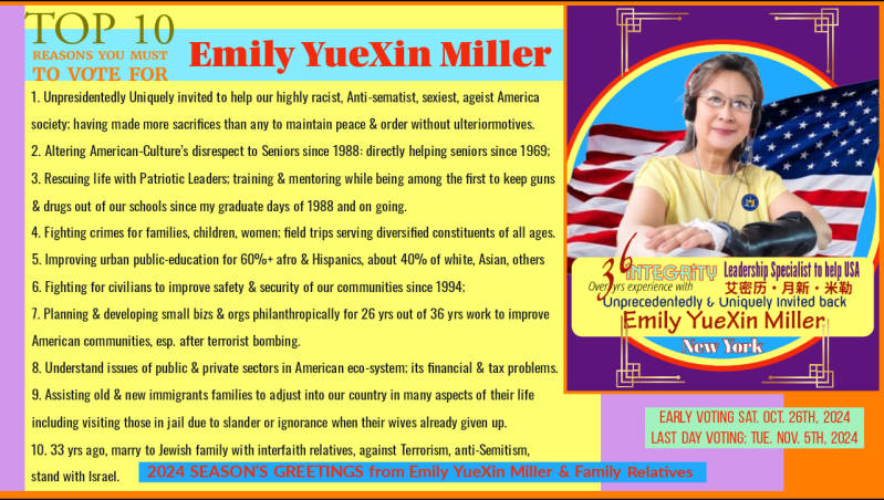 1. Emily YueXin Miller was unpresidentedly & uniquely invited back to help this mostly anti-Chinese-racist, anti-sematist, sexiest, ageist America society; Emily YueXin Miller is with interity. She helped America Philanthropically for about 4 decades. She really shouldn't be making any sacrifices, but she has made more sacrifices than all who came to this land who are suppose to, she does so to maintain peace & order without ulteriormotives.